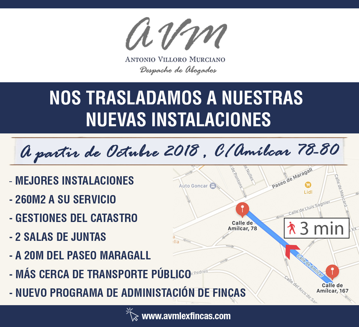 A partir de mediados de Octubre de 2018, el despacho de Antonio Villoro Murciano se traslada a sus nuevas oficinas ubicadas en la calle Amílcar 78-80.